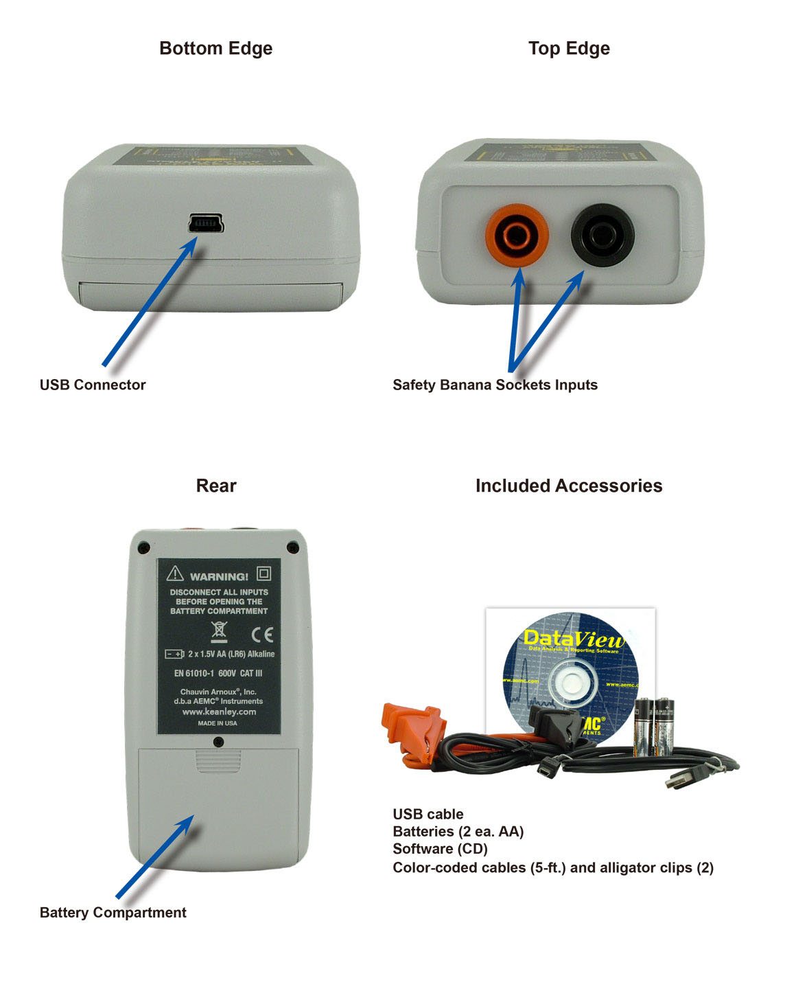 包括一个 L261 数据记录器、电池、一根 USB 数据线、一对测试导线和鳄鱼夹,以及 CD 软件