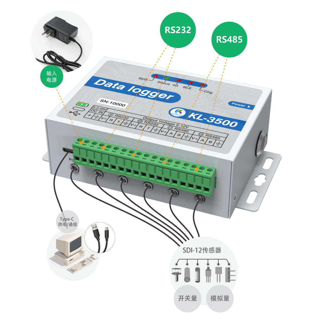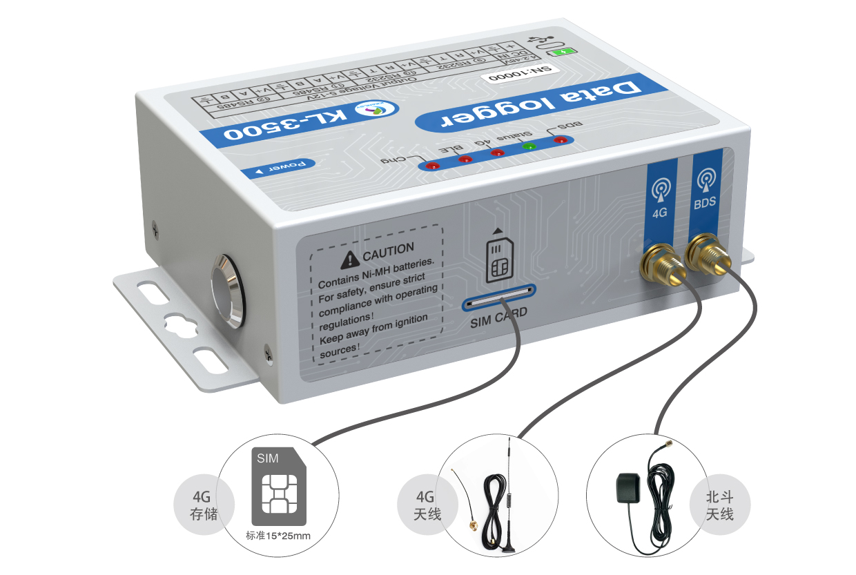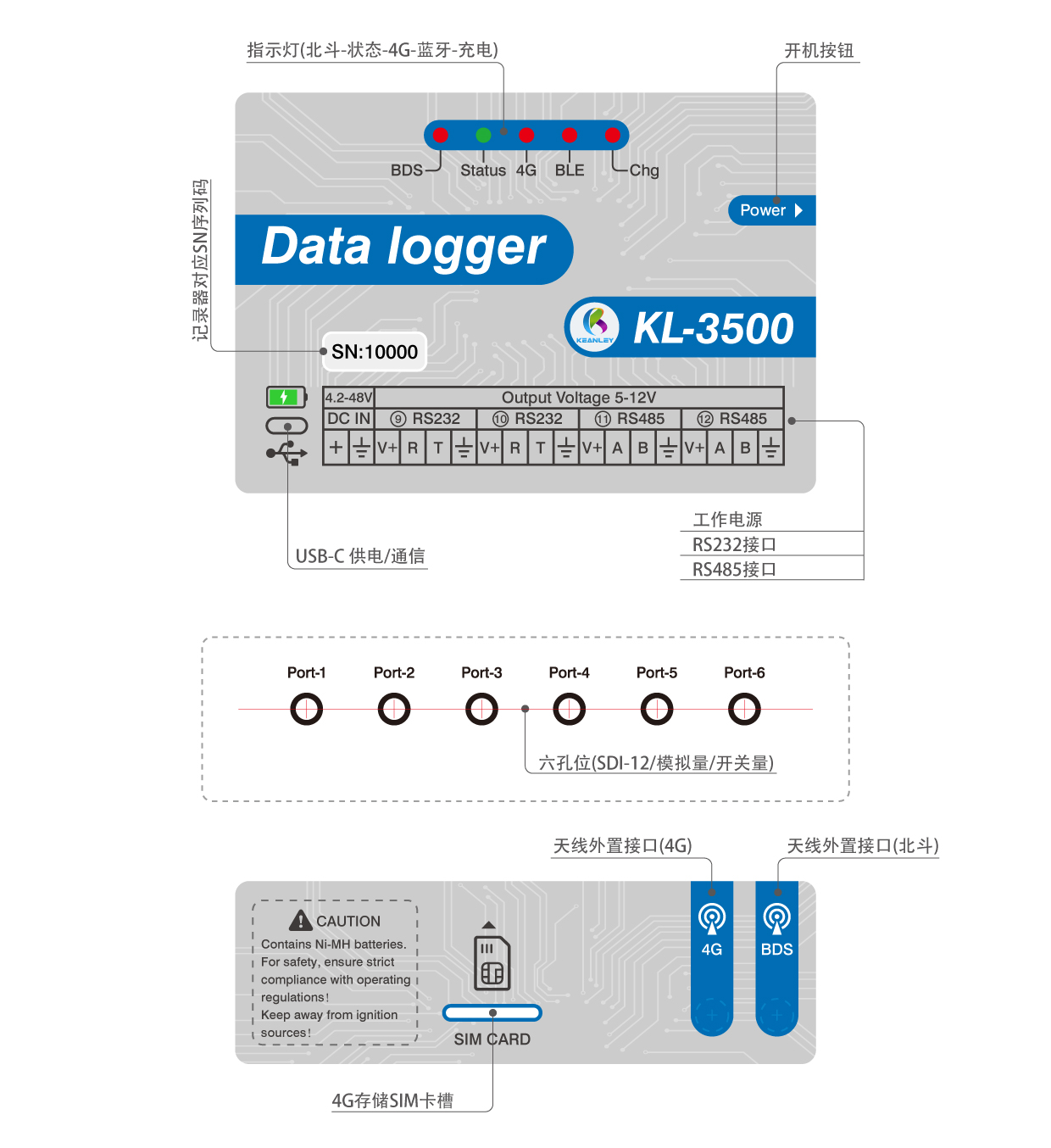 KL-3500专门用于SDI协议和DDI模式,RS485和RS232以及模拟量和脉冲量的传感器。数据记录仪有12个插接口(6个传感器接口,2个带供电的485,2个带供电的232,1个大气压温度接口,一个北斗数据口)具体参考软件界面里的接口说明,一个2P的3.81端子供电口,1个TYPE-C接口(可供电和通信)1个电源按钮,5个状态指示灯(LED1为北斗状态指示灯,LED3为运行状态指示灯,LED2为4G状态指示灯,LED4为蓝牙状态指示灯,LED5为充电状态指示灯),2个天线接口(4G通信天线,北斗天线),上部是电池仓可使用6节镍氢电池或碱性电池。